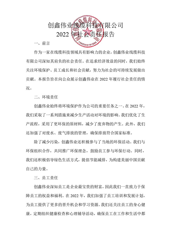 创鑫伟业线缆科技有限公司是一家集电缆研发、生产、销售、服务于一体的现代化企业。公司始建于2007年,注册资金3.18亿元,占地面积66000平方米,在编人员100余名,年产值2.5亿元左右,有管理人员、技术人员、高素质熟练工人组成了特色化的管理、生产团队。